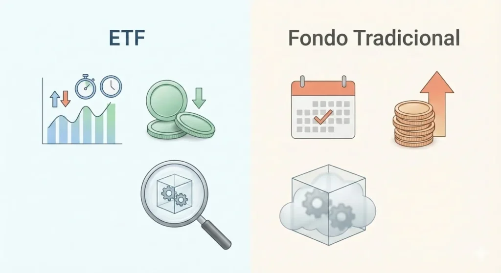 La más clara es la forma de comprar y vender. Un ETF tiene precio en tiempo real y se negocia en bolsa. Un fondo tradicional se compra o se vende a un precio que se calcula una vez al día.